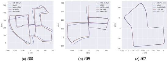 The comparison of the resulting trajectories from our method and three state-of-the-art algorithms—LOAM, LeGO-LOAM, and FAST-LIO2—is shown in Figure 7. It is evident that our method consistently produces trajectories that are closer to the ground truth across all sequences (#00, #05, #07), indicating reduced end-to-end drift errors. In particular, LOAM demonstrates significant global trajectory deviations, whereas our method maintains higher consistency with the true trajectory.