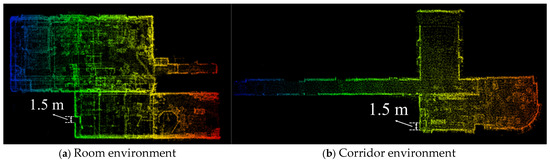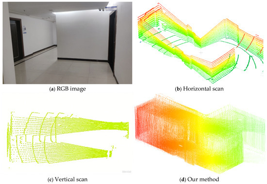 The self-collected dataset includes indoor (laboratories and corridors) and outdoor (parking lot) environments. LiDAR data were captured using a calibrated Velodyne VLP-16 mounted on a rotating platform. The IMU (Wheeltec Co., Ltd., Dongguan, China) and Intel RealSense D435i RGB camera (Intel Corporation, Santa Clara, CA, USA) were hardware-synchronized using timestamp alignment with ROS middleware. All sensors were rigorously calibrated for extrinsic parameters. The calibration accuracy was validated via checkerboard tests for the camera and point-to-plane residuals for LiDAR-IMU alignment. The data were logged at stable temperatures, and noise filtering was applied post-recording. We performed indoor 3D reconstruction using LIDAR data captured at fixed points through horizontal, vertical, and rotational scanning. As shown in Figure 9, horizontal scanning mainly captured vertical walls but missed corridor roofs and floors. Vertical scanning focused on roofs and floors but lacked wall details. However, rotational scanning provided more complete coverage with fewer blind spots, resulting in better reconstruction quality. Experiments showed that rotational scanning excelled in maintaining the integrity of 3D reconstructions compared to horizontal and vertical scanning.