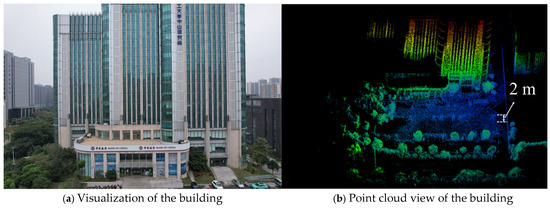Based on the experimental error analysis, it can be observed that the point cloud model generated by the algorithm proposed in this paper has an error within 5 cm compared to the actual building dimensions, indicating high accuracy. The main sources of error formation are threefold: first, the inherent measurement errors of the LiDAR itself; second, the positioning errors in the SLAM system can lead to minor deviations in the point cloud data generated during mapping; and third, the selection of different measurement points during the measurement process may introduce a certain degree of random error to the point cloud model accuracy. Overall, the method presented in this paper is capable of reconstructing building structures without compromising accuracy, thereby providing an efficient and reliable guarantee for high-precision 3D modeling.