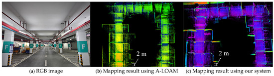 To further evaluate the performance of our LV-SLAM system in challenging environments, we conducted a comparative mapping experiment in an underground parking lot. This environment features low illumination, repetitive structures, and sparse visual features—conditions that are typically unfavorable for visual or loosely-coupled SLAM systems.
