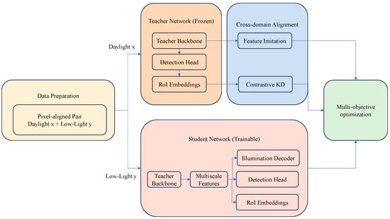 Let T and S denote the teacher and student networks, respectively, both parametrised by identical detection backbones but exposed to distinct luminance regimes. For a training mini-batch we consider a set of aligned Region-of-Interest (RoI) proposals b i i = 1 N produced by T on the daylight image x. These proposals are transferred to the low-light counterpart y through the homography computed in Section 3, ensuring spatial correspondence. Feature vectors are extracted at matching pyramid levels: