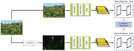 To effectively address the challenges of apple detection under extreme low-light conditions with occlusions, we introduce the Knowledge Distillation and Feature Alignment (KDFA) model (see Figure 2). This specialized neural network architecture seamlessly integrates object detection and image enhancement within a unified framework, leveraging knowledge distillation to enhance performance in adverse illumination settings.