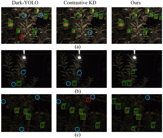 As depicted in Figure 4, CycleGAN translates each well-illuminated orchard image into a radiometrically faithful low-illumination counterpart, thereby enriching the training corpus with challenging lighting conditions. Row (a) presents three daylight references captured under sufficient luminance, while row (b) shows the corresponding underexposed images synthesised by CycleGAN. The translated images closely replicate real night-time scenes, exhibiting global brightness attenuation, elevated signal-dependent noise, and chromatic shifts, yet they preserve pixel-wise geometry. This high photometric fidelity makes CycleGAN an effective augmentation tool for developing and benchmarking illumination-robust detectors. On these synthetically darkened samples, our KDFA model maintains almost the same detection accuracy as on real nocturnal imagery, demonstrating strong generalisation to unseen radiometric shifts and underscoring its practicality for orchard environments where lighting is often sub-optimal.