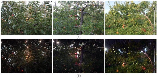 Figure 4. Daylight reference orchard scenes (row (a)) and CycleGAN-synthesised underexposed counterparts (row (b)) used for low-illumination augmentation and evaluation.
