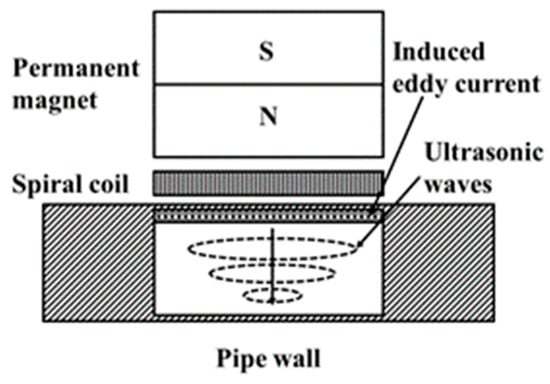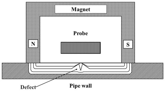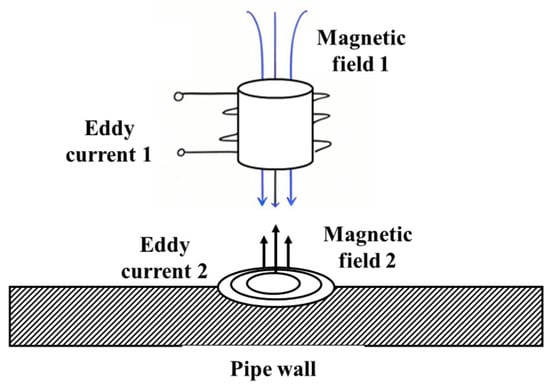 ECT technology relies on the interaction between an alternating electromagnetic field and a conductive material to achieve high-sensitivity identification of near-surface defects [], as illustrated schematically in Figure 3. This technique exhibits equal sensitivity to defects on both the internal and external walls of a pipeline. However, the identification of internal wall defects can be achieved by enhancing the resolution of the detection coil [].