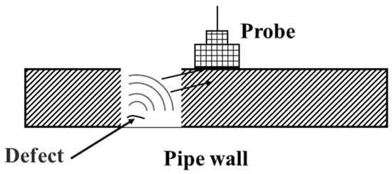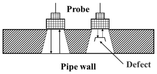 UT technology utilizes the propagation characteristics of ultrasonic waves within a medium. Defects and their locations are detected by measuring parameters of the reflected waves, such as time-of-flight and amplitude [], as schematically shown in Figure 4.