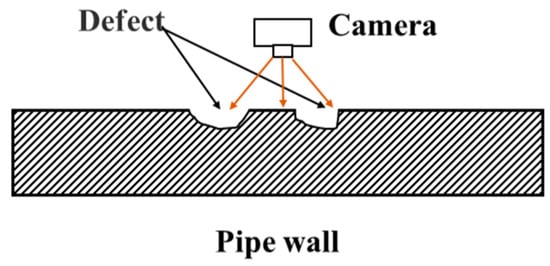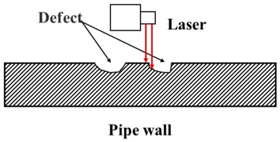 Laser inspection technology utilizes laser beams to scan the inner wall of pipelines. Geometric shape and defect information are acquired by measuring the reflected laser signals [,], as schematically illustrated in Figure 7.