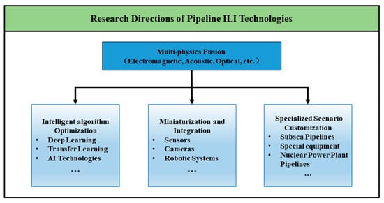 Future research in pipeline in-line inspection technologies should focus on multi-physics field fusion for comprehensive detection, integrating electromagnetic, acoustic, and laser-based multidimensional data to transition defect analysis from single-parameter evaluation to holographic characterization [], as specifically illustrated in Figure 9.