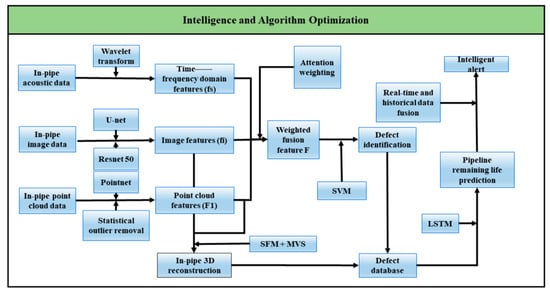 The first approach focuses on intelligent algorithm optimization, where multimodal feature fusion enhances defect recognition capability, enabling rapid, efficient, and real-time detection []. This methodology leverages data-driven model refinement to achieve comprehensive defect identification, detection, reconstruction, and prediction, as specifically illustrated in Figure 10.