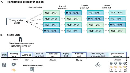 (A) Randomized crossover design. (B) Study visit. Participants completed four randomized crossover trials under different compression garment conditions (NCP, MCP, HCP, UHCP). Each session included body composition assessment, resting measurements, pressure testing, performance tests (Illinois agility test, vertical jump, and 30 s Wingate test), and post-exercise recovery monitoring at 0, 3, 5, and 10 min.