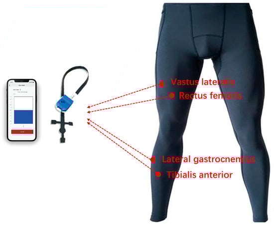 Three commercially available compression tights were selected for the experiment: ZuoYouLiLiang (ZuoYouLiLiang Sportswear Co., Fujian, China), CW-X (Wacoal Corp., Kyoto, Japan), and SKINS (SKINS International Trading AG, Steinhausen, Switzerland). Garment pressure was measured using a Texsens clothing pressure tester (novel GmbH, Munich, Germany), a flexible thin-film sensor system designed for measuring low contact pressures at the interface between the human body and textile surfaces. The device assessed the three compression-pant models in the upright position, with all garments sized to accommodate individuals 175–180 cm in height and 60–70 kg in body mass. The Texsens system has a measurement range of 1–10 kPa, a sampling frequency of 50 Hz, and a circular sensor area with a diameter of 10 mm. Data were exported in ASCII format for processing. The sensor is highly conformable, with minimal structural interference, enabling stable static pressure measurements even under mild skin deformation and temperature variation. Pressure values were ultimately expressed in mmHg. During testing, each participant stood erect while sensors were placed sequentially over the rectus femoris, vastus lateralis, gastrocnemius, and tibialis anterior (Figure 2). Three readings were taken at each site and averaged to enhance measurement reliability and accuracy. Based on the measured pressure values at rest, these garments were categorized into three compression levels: MCP, HCP, and UHCP, respectively [20].