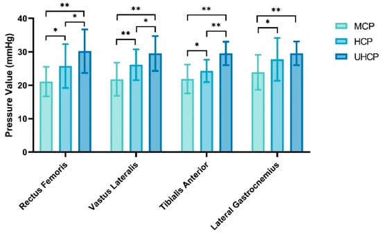 For the lateral gastrocnemius, the UHCP group showed the highest pressure, significantly greater than that of the MCP group (29.51 ± 3.53 mmHg vs. 23.89 ± 5.24 mmHg, p = 0.001), and the HCP group also demonstrated significantly higher pressure than the MCP group (27.75 ± 6.39 mmHg vs. 23.89 ± 5.24 mmHg, p = 0.022).