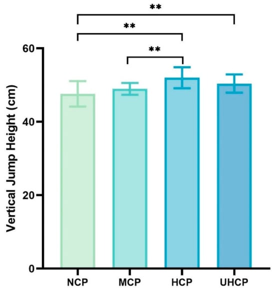 Vertical jump height under different compression pant pressure levels (** p < 0.01).