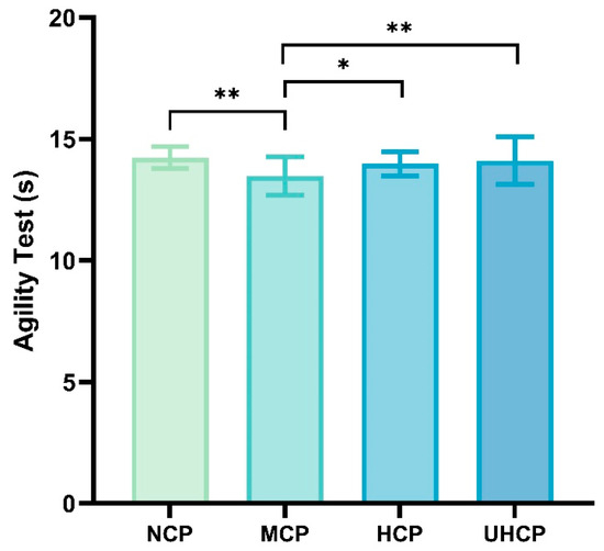 Agility performance under different compression pant pressure levels (* p < 0.05, ** p < 0.01).