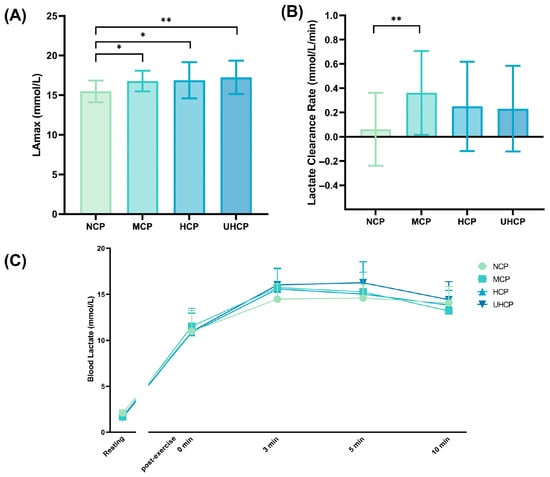 As shown in Figure 6A, following the 30 s Wingate test, the peak blood lactate concentration (LAmax) was significantly higher in the UHCP (17.24 ± 2.10 mmol/L vs. 15.47 ± 1.36 mmol/L, p = 0.003), HCP (16.87 ± 2.27 mmol/L vs. 15.47 ± 1.36 mmol/L, p = 0.017), and MCP (16.77 ± 1.29 mmol/L vs. 15.47 ± 1.36 mmol/L, p = 0.027) groups compared to the NCP group. As illustrated in Figure 6B, the lactate clearance rate at 10 min post-exercise was significantly higher in the MCP group than in the NCP group (0.36 ± 0.35 mmol/L vs. 0.06 ± 0.30 mmol/L, p = 0.007). Figure 6C presents the temporal trends of blood lactate concentrations before and after exercise. All groups showed a rapid rise in lactate levels immediately post-exercise, peaking at approximately 3 min, followed by a gradual decline over time.