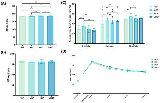 Heart rate responses under different compression pant pressure levels: (A) maximum heart rate (HRmax) during exercise, (B) average heart rate (HRavg), (C) heart rate recovery rates at 3, 5, and 10 min post-exercise, and (D) heart rate change trends before and after exercise (* p < 0.05, ** p < 0.01).