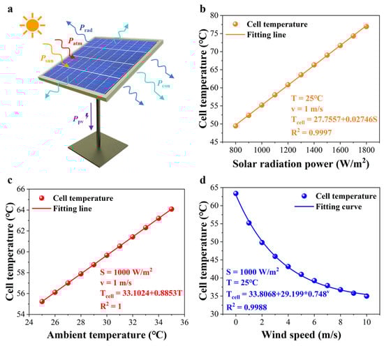 The temperature model of a PV cell. (a) A schematic illustration of the energy balance of a PV panel. (b) The relationship between solar radiation power and the cell temperature. (c) The relationship between ambient temperature and the cell temperature. (d) The relationship between wind speed and the cell temperature.