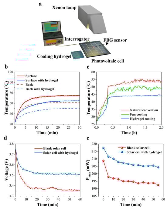 A schematic of the PV module attached with the hotspot management system and evaluation of cell performance with optical fiber attached. (a) The schematic diagram of the hotspot management system for a solar cell integrated with the FBG temperature sensor array and the PAM-CaCl2 hydrogel. (b) The schematic expression of the structure of FBG. (c) Schematic of the hygroscopic hydrogel applied in this work, with a PAM hydrogel as the substrate and PAM-CaCl2 as the sorbent.