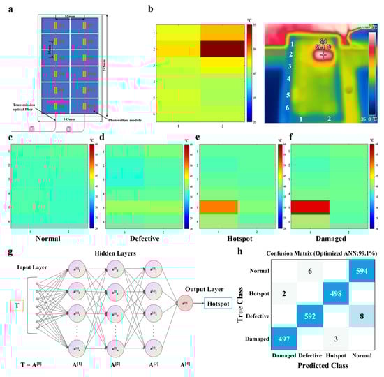 Outdoor hot spot detection and classification. (a) Structure diagram of the FBG sensor arrays pasted on the PV panel. (b) The hot map by FBG arrays and infrared thermal image of a hot spot on the PV panel. The hot map of (c) a normal PV panel, (d) a defective PV panel, (e) the PV panel with a hotspot and (f) a damaged PV panel. (g) Schematic expression of ANN with a Bayesian optimization for classifying PV panels. (h) Confusion matrix of the validation set with various PV panels.