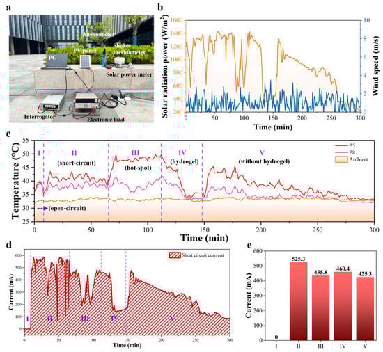 The field tests took place in June because the outdoor environment had enough solar radiation power and high temperatures, which easily cause safety hazards. As depicted in Figure 5b, the local climate, including solar irradiance and wind speed, was recorded from 11:25 to 16:25 on 18 June 2024. The maximum solar radiation power of the day reached up to 1400 W/m2 and the range of wind speed ranged from 0 m/s to 3 m/s. There were five stages in the process of the outdoor field test. The temperature curve and the corresponding current curve were divided into five parts, as described in Figure 5c,d, respectively. As for the study of hotspots, the temperature of the non-hotspot area (P8 region) on the PV panel was compared with the high temperature of the hotspot area (P5 region). Considering the influence of the environmental temperature, the ambient temperature of the test environment was recorded as ranging from 32 °C to 34 °C using a shelter thermometer. Allowing for the generation of hotspots, the loop current in the PV panel should be sufficient. Thus, the electronic load was set to zero and the short-circuit current (SCC), as a power generation parameter, was recorded in real time (Figure 5d). The sampling rate was set to once per second for each test instrument. In region I, the current was always zero with the PV panel in an open-circuit state. Meanwhile, the temperatures measured for P5 and P8 were almost the same and 7 °C higher than the ambient temperature. Instead of the open-circuit state, the temperature detected for P5 and P8 in region II of the short-circuit state had increased widely and the temperature became uneven during the whole of second stage. The difference between P5 and P8 was 2.6 °C, a difference caused by the cell of P5, which was an internal defect in the PV panel, as shown in Figure S25. In parallel, the SCC was changed from 63.9 mA to 587.9 mA under the variable solar radiation and the mean SCC was 499.4 mA. In region III, an opaque sticker was pasted on the PV panel to cover 20% of the P5 cell area by simulating the hotspot effect. The gap between P5 and P8 was 9.1 °C, approximately, resulting in a clear drop with the mean of 100 mA in SCC. The peak value of the P5 temperature reached 50 °C within six minutes from 40.1 °C, indicating the rapid generation of hotspots in a short period of shading. Thus, it is necessary for PV modules to be subjected to a quick hotspot diagnosis. When a cooling hydrogel was attached to the back of the hotspot area, the temperature of P5 was decreased from 49.8 °C to 33.8 °C with 22 min via cooling due to the hydrogel and wind in region IV. Considering only the cooling effect of the PAM-CaCl2 hydrogel, the difference in the temperature change between P5 and P8 had the value of 7.7 °C. Unfortunately, the solar radiation power appeared in a wide valley in the fourth stage, leading to an incomprehensible SCC changes due to cooling. In the last region, the cooling hydrogel was removed, with the P5 temperature rising again. However, the P5 temperature continually fell from 45.6 °C to the ambient temperature in fifth stage, with a persistent decrease in the solar radiation power. At the same time, the difference in temperature of P5 and P8 was 6.4 °C. Like region IV, the trend in SCC was consistent with the variation in the solar radiation power. To exclude the effect of sunlight on SCC, the comparison of the five stages can be organized under the same solar radiation power. As shown in Figure 5e, the SCC comparison of the five regions was carried out under a similar solar radiation power, with 1.2 kW/m2. At the beginning of the first region, SCC was zero due to an open-circuit state. In region II, SCC reached up to 525.3 mA with a short-circuit state. With a shading in region III, SCC decreased to 435.8 mA by 17% and then rose up a little to 460.4 mA by 5.6% after cooling in region IV. Finally, SCC also declined to 425.3 mA when removing the cooling hydrogel. Through carrying out a hotspot management system, the hotspot can be detected and cooled down by realizing predictive maintenance.