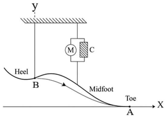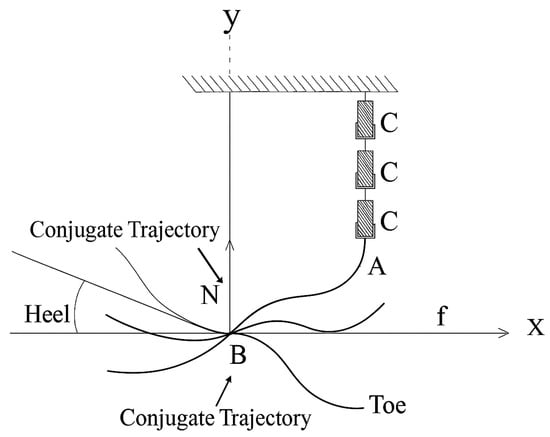 Ankle joint rotation angle α. A, B—key points of the foot; C—actuator/motor positions; N—normal vector; f—force direction; x, y—coordinate axes.