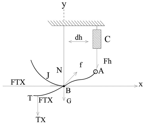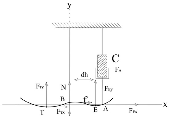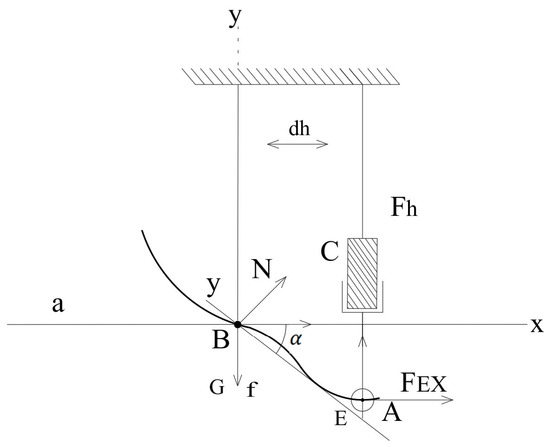 The trajectory of motion between points A and B is shown. Point C represents the element applying the load to the exoskeleton, while M denotes the motor. This schematic illustrates the required motor force and geometric constraints necessary to follow the specified trajectory.