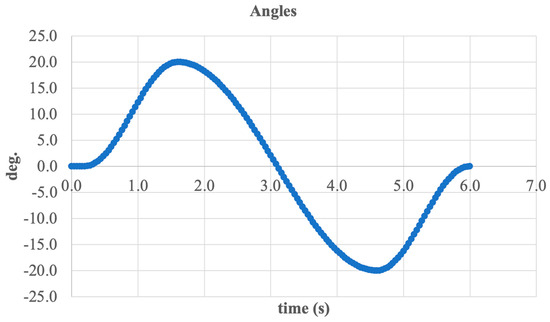 The graph demonstrates harmonic variation in the angle within a range from −22 deg. to +20 deg., covering the full physiological range of motion in the sagittal plane. This angular displacement enables the execution of both the extension (plantarflexion) and flexion (dorsiflexion) phases essential for normal gait.