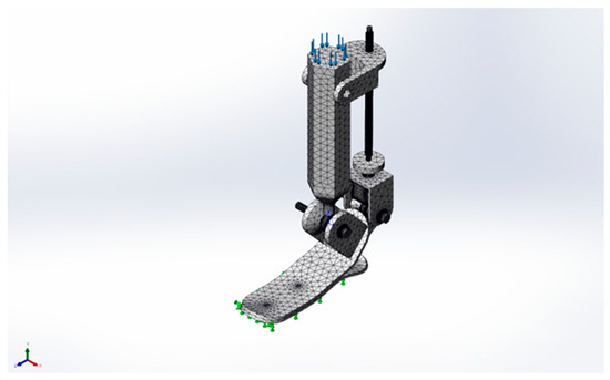 The model was constrained at the shank attachment interface to replicate the fixation of the prosthesis to the residual limb. A vertical load simulating the ground reaction force (GRF) during mid-stance was applied to the foot sole, representing the phase when the entire body weight is supported by the stance leg.