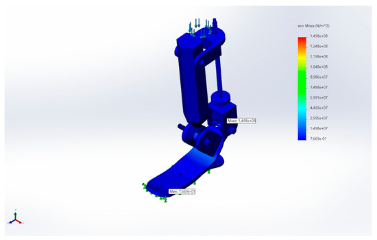 To evaluate the structural performance and reliability of the design, a finite element analysis (FEA) was carried out using SolidWorks 2024 Simulation. The analysis was conducted under static loading conditions to determine the stress distribution, deformation behavior, and strain levels under forces typical for the stance phase of gait.