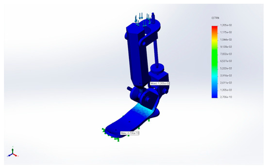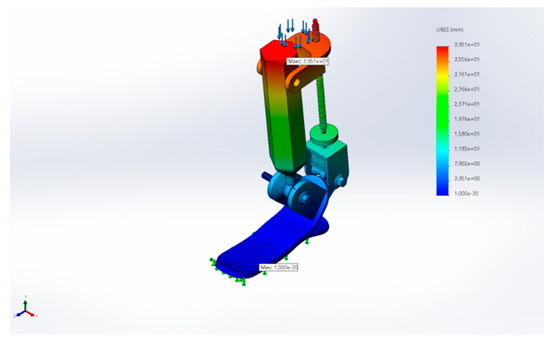 It is important to note that the reported angular displacement range of ±20–22 deg., corresponds to the theoretical mechanical capabilities of the prosthesis in both motion planes, as verified through kinematic simulations. Meanwhile, the dorsiflexion angle of approximately 7 deg., observed in the FEA study, represents elastic deformation under static vertical loading and does not indicate the full actuation capacity of the system. This clarification ensures consistency between the mechanical design intent and the numerical modeling outcomes.