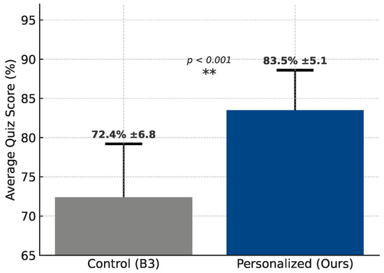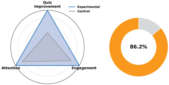 Beyond technical performance, we evaluated the educational impact of the framework. As shown in Figure 10, the experimental group outperformed the control group across all three learning metrics: quiz-score improvement, self-reported engagement, and teacher-assessed attention. Normalised radar plots indicate a 1.9-fold increase in cumulative performance. Additionally, the doughnut chart illustrates that 86.2% of personalized interventions triggered by the AI tutor led to verifiable behavioural improvements, such as completing micro-quizzes or following recommended schedules. These results validate the framework’s effectiveness in enhancing both cognitive and affective educational outcomes. A detailed comparison of the experimental and control groups across educational performance metrics is presented in Table 4.
