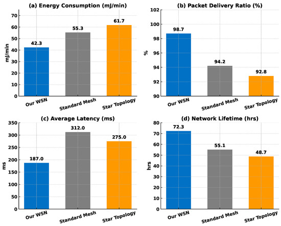 The wireless sensor network operates using the IEEE802.15.4 standard [43] and ZigBee protocols to form a robust mesh network. Mathematically, the WSNs [44] are represented as a graph , where V is the set of sensor nodes, and E is the set of communication links. Each link between node i and j has associated attributes such as energy consumption , bandwidth , and latency . The network optimisation model seeks to minimise total energy consumption while ensuring data transmission quality, formulated as follows: