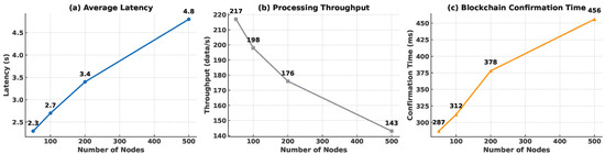 As shown in Figure 7, (a) average end-to-end latency increases from 2.3 s to 4.8 s, exhibiting a sub-linear growth that remains acceptable for real-time monitoring. (b) Processing throughput declines by 34% (217 → 143 data/s) yet stays above 140 data/s even at 500 nodes, confirming sufficient processing capacity under load. (c) Blockchain confirmation time rises from 287 ms to 456 ms because of the larger consensus set but still satisfies the 0.5 s upper-bound required for timely data integrity guarantees.