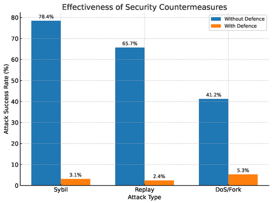 Figure 8 contrasts the attack success rate (ASR) obtained with and without the counter-measures. Without defence, Sybil and replay attacks compromise 78.4% and 65.7% of blocks, respectively, whereas DoS/forking still succeeds in 41.2% of trials. After enabling the ECDSA + AES identity layer, the nonce–hash aggregation freshness filter, and the PoA-ACL consensus guard, ASR plunges below 6% in all cases (average drop 92.6 pp), demonstrating that the layered design can almost completely neutralise the adversary even when one-fifth of the network is hostile.