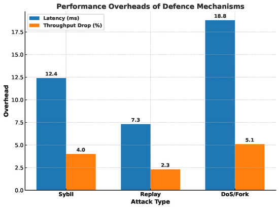 To quantify the protection strength of the proposed security stack, we replayed the three most common attack vectors identified in Sybil identity spoofing, replay injection, and DoS/fork manipulation—under the same 200-node PoA test-bed used in the scalability study (20% malicious traffic; five 300 s rounds).
