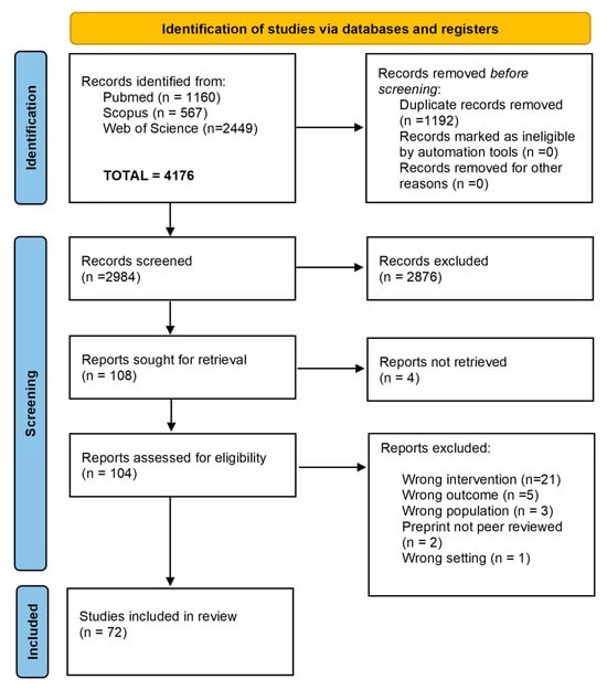 Four were excluded due to the unavailability of the full text. Out of the remaining 104, 72 were included in this systematic review. Figure 1 shows the PRISMA flowchart. Given the considerable heterogeneity in study tools, scope, design, and outcome measures, conducting a meta-analysis was deemed inappropriate, so the results were synthesized and presented using a narrative approach. The participants in the selected studies amounted to 7949 people, of which 5727 had pathological conditions (54 of them enrolled in a control group), and 2222 were healthy subjects (all in a control group). The study sample sizes ranged from a few units (n = 4) [,] to a few thousand (n = 4126) []. Mean, median, and modal sample size values were 110, 30, and 12, respectively. Six studies on Parkinson’s disease (PD) [,,,,,], one on Huntington’s disease [], and one on multiple sclerosis [] enrolled more than 90 subjects.