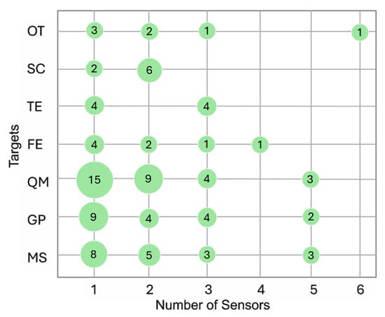 Information about the number of sensors applied to the patients, the parameters analyzed (quantity of movement (QM), fall event/risk (FE), turning events (TEs), gait parameters (GPs), motor symptoms (MSs), clinician-assessed or self-reported scales/indexes (SC), other (OT)), and the number of studies involved in this matching. Legend: green circle = studies involved; size of the circle = proportional to the number of the studies involved.