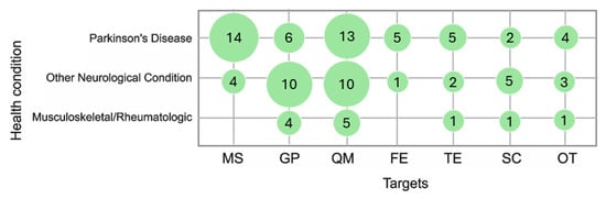 Targets (quantity of movement (QM), fall event/risk (FE), turning events (TEs), gait parameters (GPs), motor symptoms (MSs), clinician-assessed or self-reported scales/indexes (SC), other (OT)) analyzed in the different health conditions and how much this matching is represented in this review. Legend: green circle = articles describing the related pathological condition; size of the circle = proportional to the number of the articles involved.