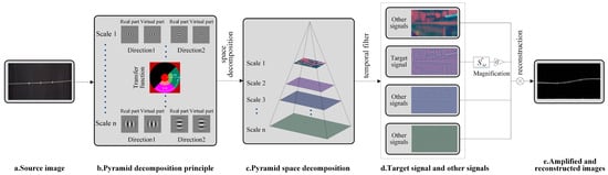 Using frequency-domain bandpass filters [,] to amplify the motion signal components of holographic feature points within a specific frequency band, Equation (11) is converted to the frequency domain. Since only the motion signal components of holographic feature points are tracked and amplified, the motion can be considered global. Therefore, the global Fourier transform [] can be directly applied to decompose the digital image sequence data into sinusoidal signals. For amplification of local motion, a controllable pyramid [,] is used to decompose digital image sequence data into a series of base function signals at different spatial scales and in different directions, as shown in Figure 3.