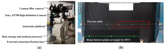 The holographic visual sensor (HVS), proposed in previous studies [,], enables high-resolution, non-contact monitoring, which has been proven advantageous for vision-based structural health monitoring, particularly in enhancing data visualization and real-time analysis. In this study, the HVS is used as a tool for obtaining the spatial–temporal sequence data of the stayed cable. In addition, the dense holographic feature points and continuous motion signal spectral components can also be defined by this equipment across the surface of the monitored stayed cables. The HVS is composed of a Canon 5Dsr camera and a Sony AX700 high-definition camera, as shown in Figure 6a. The motion signal spectral component of the holographic feature points for target tracking is shown in Figure 6b. Details of the data preprocessing procedures can be found in previous studies [,], which provide the foundation for the proposed framework in visual tracking and amplification of weak cable vibrations, aimed at identification of full-field dynamic parameters and tension estimation.
