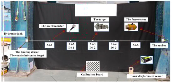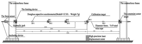 A series of experiments were conducted on the stayed cable models. A stainless-steel wire rope with a diameter of 6 mm and a 7 × 19 strand configuration was used as the scaled model, with the corresponding parameters listed in Table 2. The schematic diagram of sensor arrangement and instrumentation setup is shown in Figure 7, while the overall layout of the experimental site is presented in Figure 8.