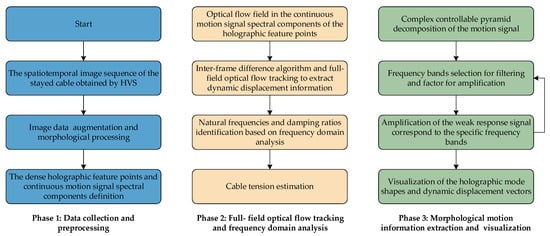 Additionally, the holographic feature points are continuously tracked and analyzed for their local mechanical responses. The selected frequency bands, phase information, and amplified amplitudes can be integrated with the dynamic displacement to reconstruct the dynamic displacement vector of the stayed cable. By integrating the methods introduced in Section 2.1 and Section 2.2, a comprehensive monitoring workflow for the stayed cables via full-field dynamic parameters identification and tension estimation is established shown in Figure 9.