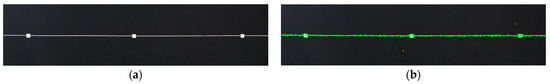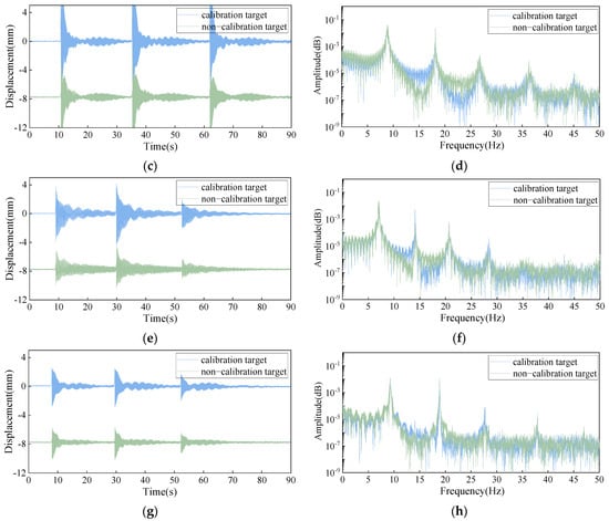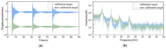 The HVS is employed to capture the dynamic response visual data of the stayed cable, and the sample rate is 100 Hz. The continuous motion signal spectral components and the holographic feature points of the stayed cable are presented in Figure 10. To evaluate the effectiveness of the proposed algorithms, the multi-target calibration points D#-1, D#-2, and D#-3 are used to extract the corresponding dynamic displacement. Subsequently, frequency-domain analysis is conducted on these signals. In this experiment, the impact of changes in lighting conditions on optical flow tracking has not been considered yet, as the laboratory environment’s lighting conditions remained relatively stable over short durations. The frequency-domain analysis results for the D#-2 and the non-calibration target are presented in Figure 11.