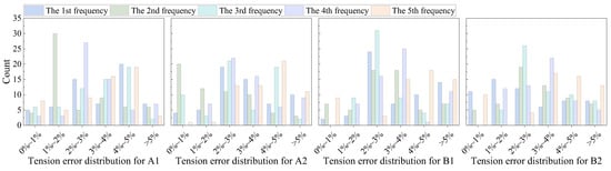 At the same time, the results and errors of the statistical distribution analysis of all 60 independent tests under the four conditions are summarized in Figure 12. The tension errors are categorized into the following ranges: 0–1%, 1–2%, 2–3%, 3–4%, 4–5%, and greater than 5%. For each frequency order, the count of errors within these ranges is reported. Among all results, the majority of errors fall within the range of 1% to 4%, indicating that the proposed method exhibits strong stability and reliability in identifying the natural frequencies and cable tensions. However, a small part of the cases have errors exceeding 5%, primarily associated with higher-order frequency estimates under the B1 test condition. In summary, the proposed method demonstrates consistent and dependable performance in tension identification while maintaining a high level of accuracy. These advantages highlight its potential for the structural health monitoring of the stayed cables in practice.