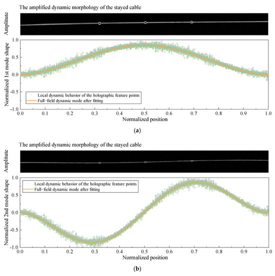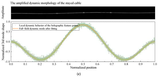 From Figure 14, it can be observed that the image signal is enhanced within a specific frequency band. Intuitively, the vibration modes of the stayed cable become visually distinguishable, and the amplified dynamic morphology presents a clear and smooth edge. The motion signal spectral components of the holographic feature point set P are also amplified and normalized, and the local dynamic behavior of the holographic feature points is used to fit the full-field dynamic mode of the entire stayed cable. The results of the amplified dynamic morphology and the normalized holographic mode shapes indicate that the proposed HFPVM algorithm in this paper can effectively amplify weak morphological motion information in a specific frequency band and can extract and visualize the modal shapes of stayed cables, providing smoother holographic modal shapes.