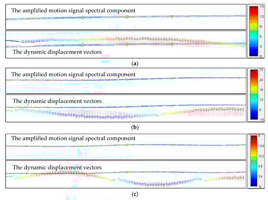 The amplified motion signal spectral component and dynamic displacement vectors. (a) Spatial dynamic shape distribution of the first-order component. (b) Spatial dynamic shape distribution of the second-order component. (c) Spatial dynamic shape distribution of the third-order component.