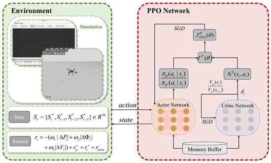 Compared to value-based methods, policy-based reinforcement learning offers distinct advantages by directly learning the policy itself, thereby accelerating the learning process and enhancing decision-making performance in continuous action spaces. PPO integrates policy gradients with importance sampling to address the inherent sample inefficiency of basic policy gradient methods. Utilizing an actor–critic architecture, the PPO-based quadrotor controller design is illustrated in