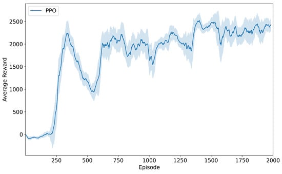 Figure 7 shows the corresponding average reward curve: During the initial 200 episodes, the policy engaged primarily in random exploration, resulting in substantial reward fluctuations near zero. Between episodes 200 and 350, guided by the advantage function, the policy distribution converged toward optimal trajectories, causing rapid reward growth. From episodes 350 to 600, the clipped probability mechanism constrained excessive gradient updates, leading to a transient reward decrease. Beyond episode 600, entropy regularization stabilized the reward curve, maintaining high values with minimal oscillations.