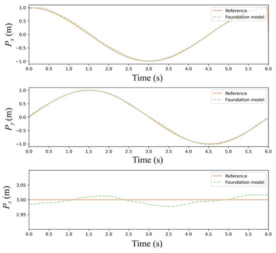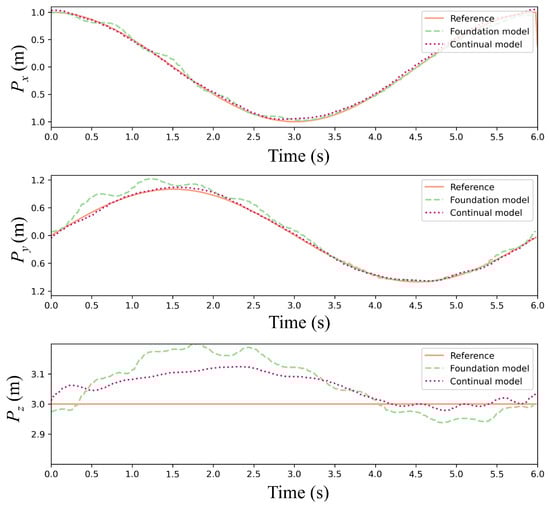 . The trajectory reference entailed a circular path with a radius of 1 m starting from the initial position at (1, 0, 3) m, moving at a constant linear velocity of 1 m/s. The evaluation criterion remained the RMSE of positional tracking, comparing two methods: the foundational model and the proposed continual reinforcement learning model. The training duration spanned 100 episodes to observe long-term adaptation trends.