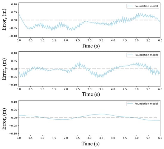 Figure 10, the foundation model achieves high-precision trajectory tracking in wind-free environments. The policy achieves precise tracking with near-perfect circular closure, indicating negligible cumulative drift. Maximum deviations occur at curvature maxima where centrifugal forces peak, yet all-axis errors remain below 0.05 m, satisfying precision thresholds for quadrotor maneuvering tasks.